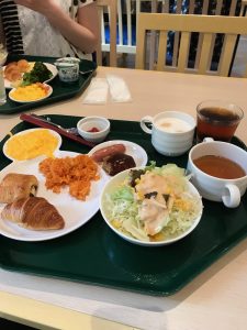 食べ物は普通のレストランと同じく食べ放題(ブッフェ)。パンからチキンライス、サラダ、スープ、肉、シリアルなどがあった。